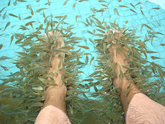 En estos nuevos centros, se empezó a utilizar a los peces en pequeños estanques de agua caliente en los que se introducían sólo los pies, con el fin de eliminar las “durezas” y callos tan frecuentes en estas regiones del cuerpo. A posteriori, se ha extendido la costumbre de sumergir el cuerpo entero y dejar a los peces hacer. Los que lo han probado aseguran que se trata de una terapia muy relajante.